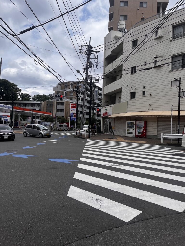 坂を下りきると横断歩道が見えてきますので、そのまま進行方向に沿って横断歩道を渡ってください。